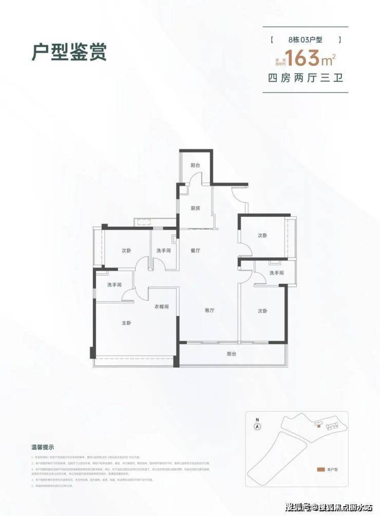 163㎡的4房2厅3卫,设计的是竖厅格局,一梯一户,进门入户玄关,LDKB一体化设计,三开间朝南,双主卧套房,客厅连接次卧出大阳台,L型厨房还带1个生活阳台,卫生间干湿分离,得房率约82%(不含赠送),东南朝向。