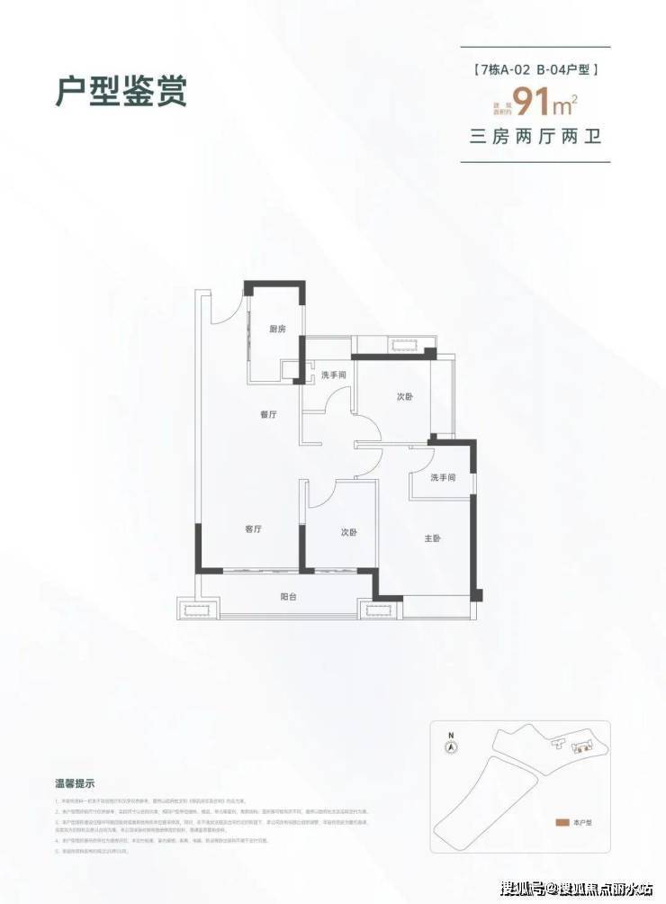 91㎡的3房2厅2卫,设计的是经典竖厅格局,进门入户玄关,LDKB一体化设计,三开间朝南,动静分区,客厅连接次卧出大阳台,L型厨房,公卫三段式分离,得房率约82%(不含赠送),东南朝向。