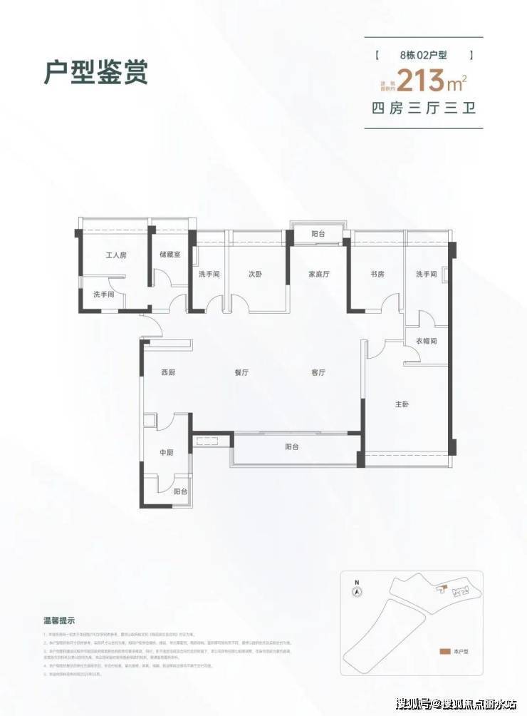 213㎡的4房3厅3卫,设计的是横厅南北通透格局,一梯一户,进门入户玄关,LDKB一体化设计,四开间朝南,双阳台通透,主卧大套间设计,还配有保姆独立套房,中西型多功能厨房,卫生间干湿分离,得房率约82%(不含赠送),阳台主朝东南向。