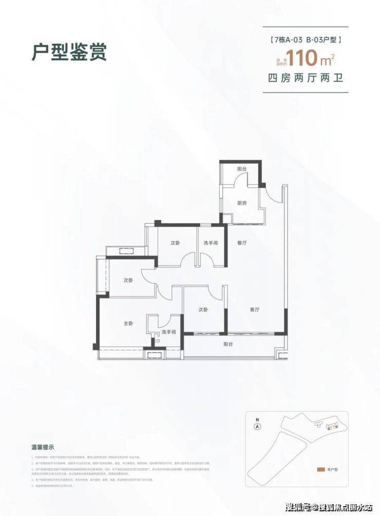 110㎡的4房2厅2卫,设计的是经典竖厅格局,进门入户玄关,LDKB一体化设计,四开间朝南,动静分区,客厅连接次卧出大阳台,L型厨房还带1个生活阳台,卫生间干湿分离,得房率约82%(不含赠送),东南朝向。