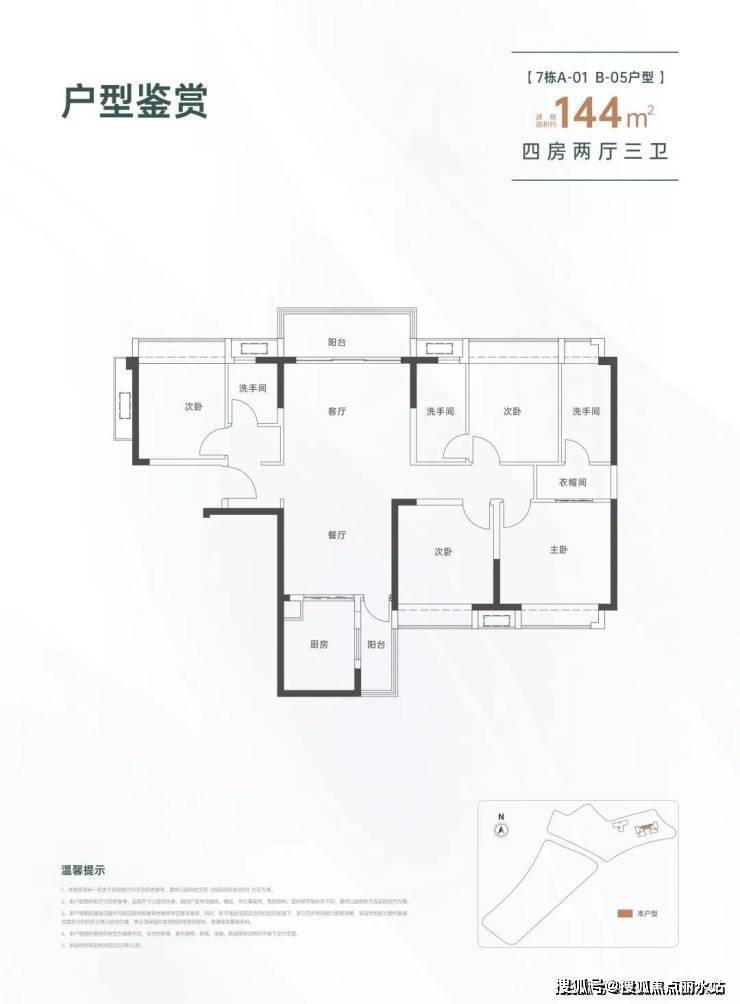 144㎡的4房2厅3卫,设计的是竖厅南北通透格局,进门入户玄关,LDKB一体化设计,双主卧套房,L型厨房还带1个生活阳台,公卫干湿分离,得房率约82%(不含赠送),阳台主朝西北向。