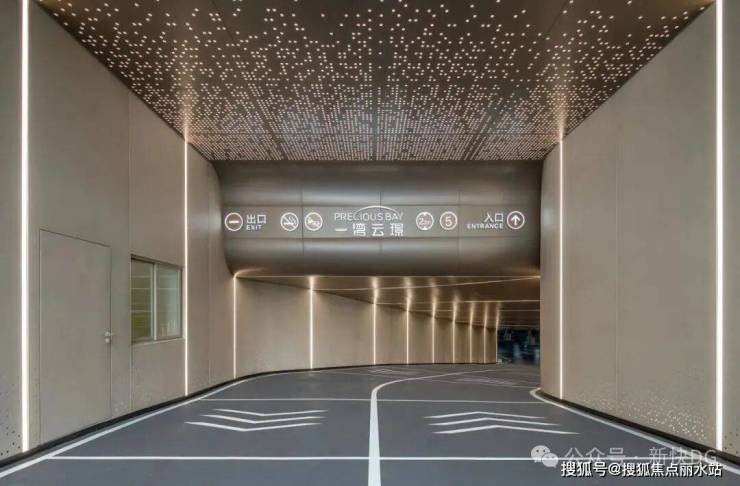 采用天然石材打造约约40米宽超尺度恢宏大门,大面积采用高端石材贝金米黄,搭配进口奢石蓝翡翠与纯手工锻打的仿紫铜照壁,汲取深圳南山香格里拉酒店大门设计灵感,定制高达5米的仿紫铜装饰大门,增加酒店式落客区,车库入口设置动态灯光效果,给予业主第一道归家礼序的舒适与尊贵。