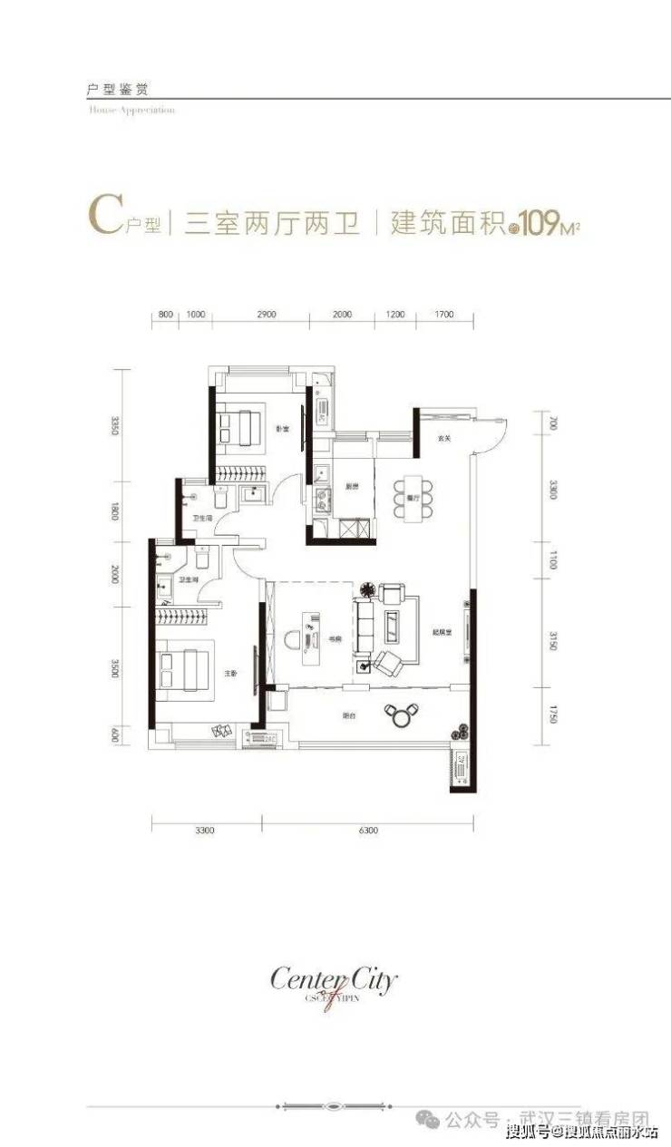 【C户型】建面约109平米,三室两厅两卫设计。约6.3米11平方南向大阳台,三开间朝南,南北通透设计;U型厨房,更多操作空间,与家人同享烹饪乐趣;双次卧自带全景飘窗,欣赏窗外的四时风姿。