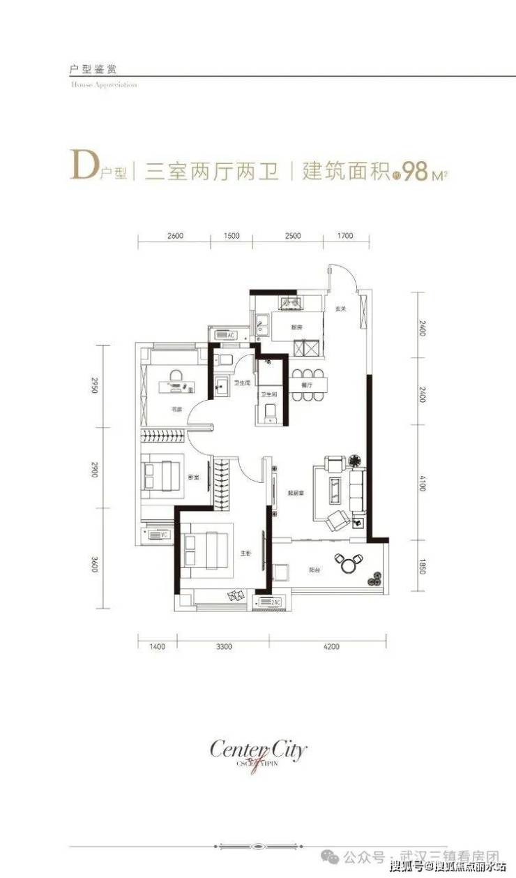 【D户型】建面约98平米,三室两厅1.5卫设计,户型方正、动静分区、功能齐全。约9米三开间朝南格局;客餐厨一线相连,尽享美味欢聚时刻;主卧自带阔尺飘窗,拥揽窗外美景。
