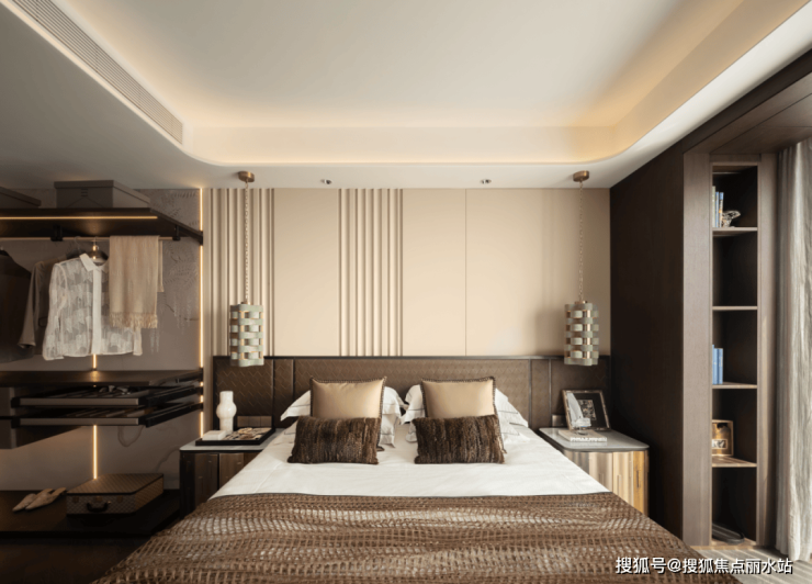 主卧搭配流光溢彩的金属灯具,散发一种内敛的奢华,让人感受到平和与尊崇。舒适颇有质感的地毯与床品相映,低调而不奢华,温厚而不俗雅。