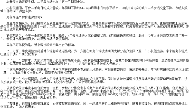 5月8日电2021年“五一”小长假,与火热的出行场景不同,在前期调控政策大幅收紧的背景下,房地产市场表现得相对“淡定”。