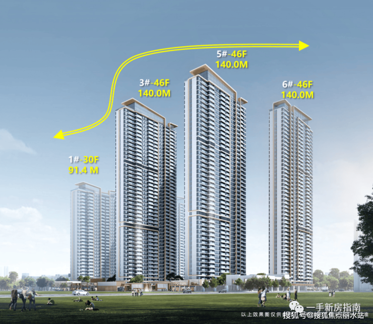 项目由6栋30-46层的高层、超高层和一所幼儿园组成。