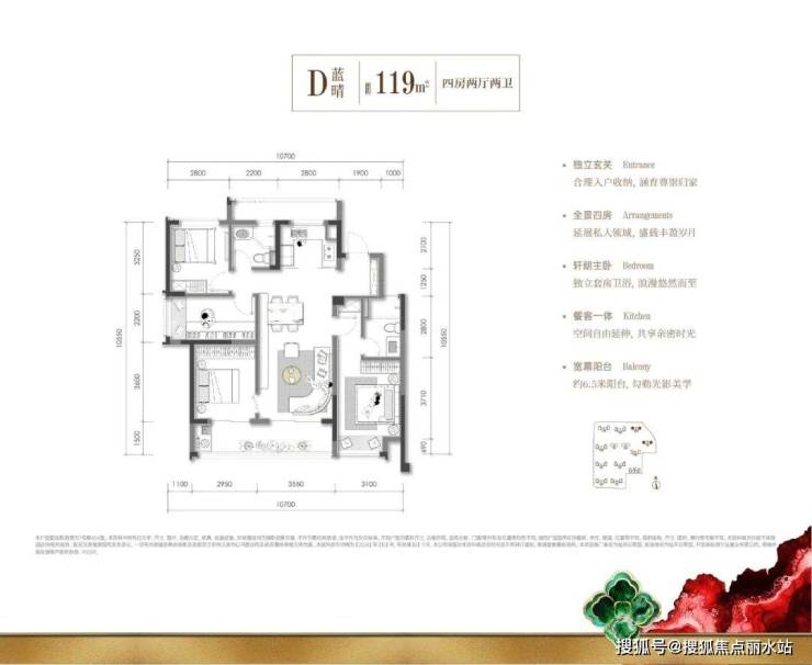 建面约119㎡精致四居,难得一遇的边套南厅舒适格局,约6.5米阳台无界连通餐客厅及独立玄关、套房式主卧,直接带来居住感受的实质性跃升。