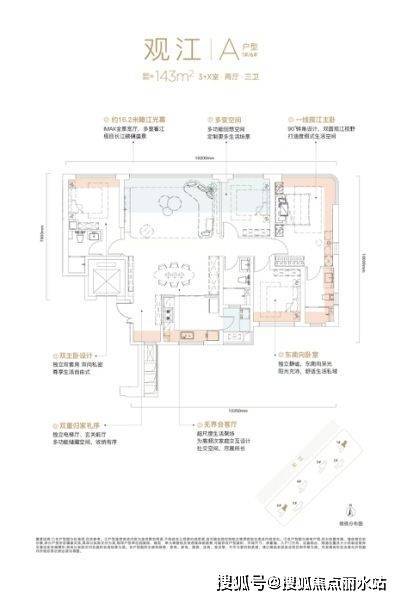 143㎡的经典3+1居室户型,户型面宽可达市面少见的16.3米,创新设计可变弹性空间,约9米宽的大横厅设计,实现更多生活场景可能;同时搭配3卫设计,实现双主卧套房,满足更多家庭使用需求。