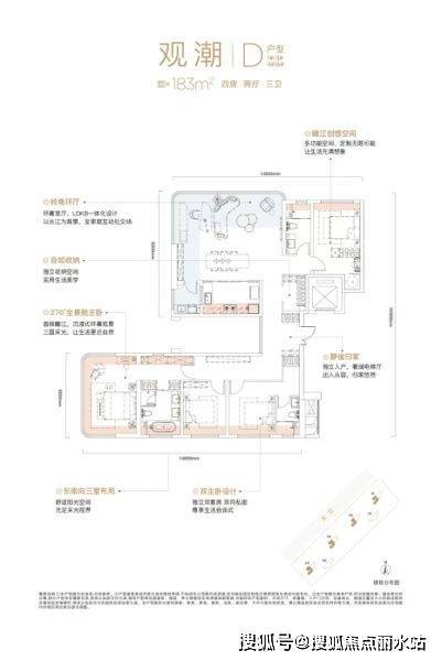 184㎡户型采用创新“双全景舱”概念设计,实现约45㎡超大IMAX环幕厅,一线江景尽收眼底,搭配约2.5米高落地玻璃,模糊室内外界限;主卧采用270度U型玻璃幕设计,实现观江视野最大化。可改三套间的设计满足高端客群的私密生活享受,入口处设计创新X空间,实现高端品质生活场景演绎