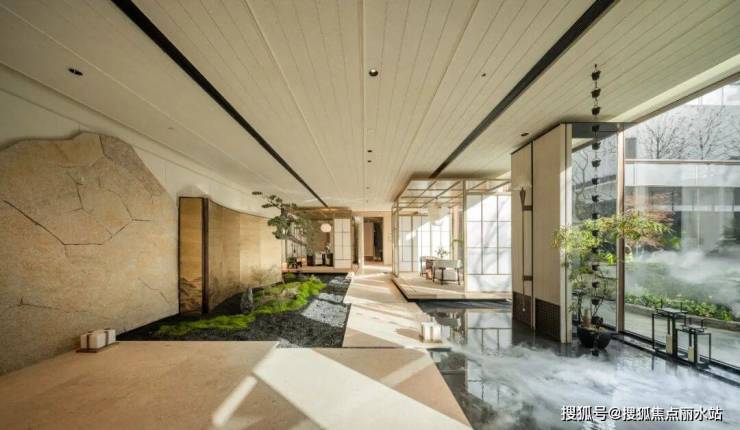 在下沉会所的落地窗前向外看,下沉庭院更如同一幅山水画。山石、悬瀑、乔木,错落间尽显韵味。四个角落分别栽种了名贵的老桩茶梅、羽毛枫、铁冬青、斜飘乌桕,四季皆景。