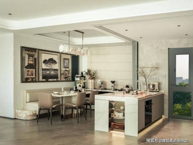 我记得项目发布会,介绍这个户型时提到:它可以让你一日三餐在三个地方用餐,比如早餐可以在厨房岛台快速解决,午餐坐在餐厅里享用,晚上则可以在室外露台,伴着月光,来场浪漫的烛光晚餐。
