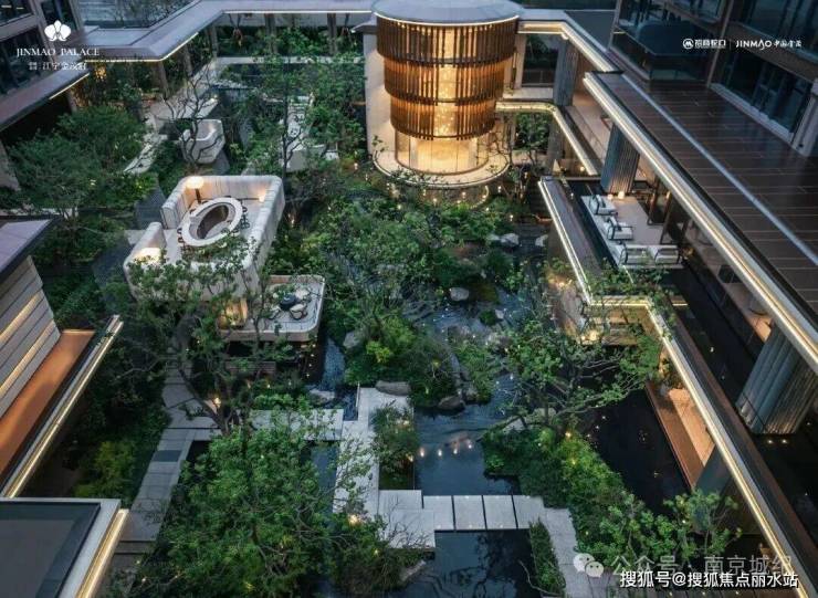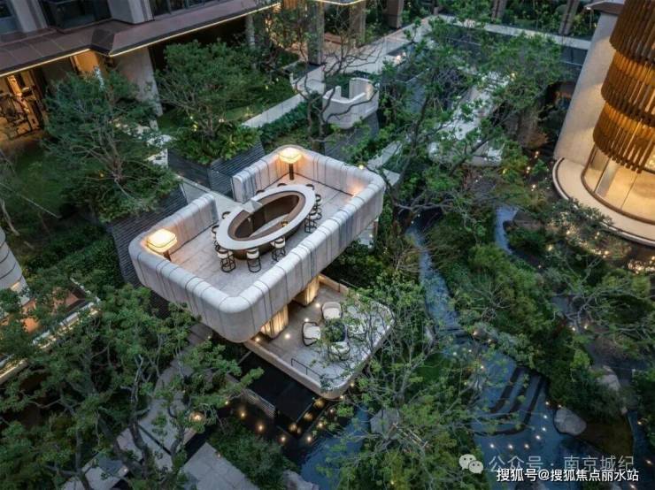 园林不再是平面的点缀,而是立体的生命体。金茂府以“江宁织造”为灵感,通过多层高差设计,将空中花园亭台、约6米飞瀑、溪谷山水与森屿叠翠“穿针引线”,编织成一幅约1400㎡的立体云锦图腾。漫步其间,一步一景,实现了自然意趣与人文底蕴的完美交融,打造出一座可供沉浸式体验的城市森林秘境。