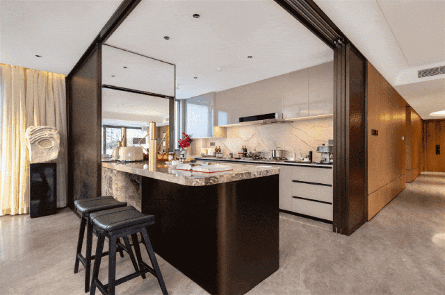 整体采用双洄游动线设计,一面融入社交属性的客厅、一面连接家政间、厨房。