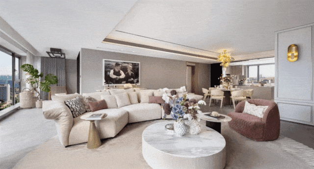 户内270°转角端厅巨幕视野,将窗外蓝天白云、葱翠园林及城芯璀璨霓光悉数尽揽。
