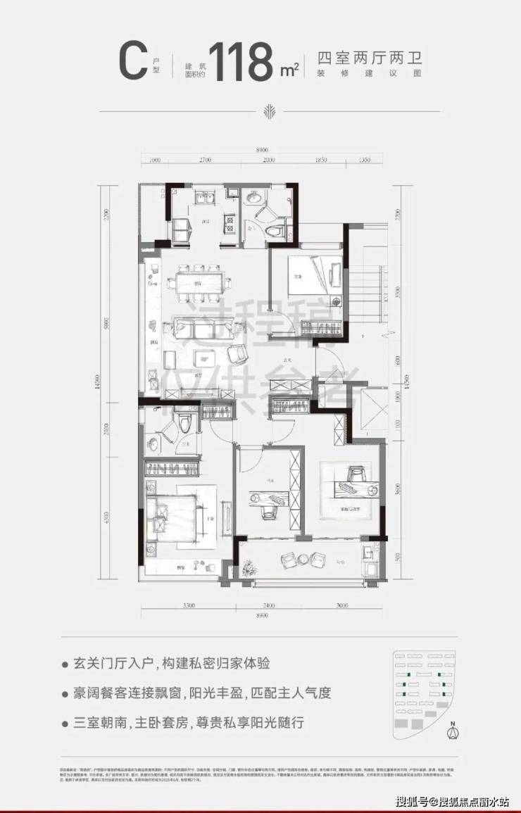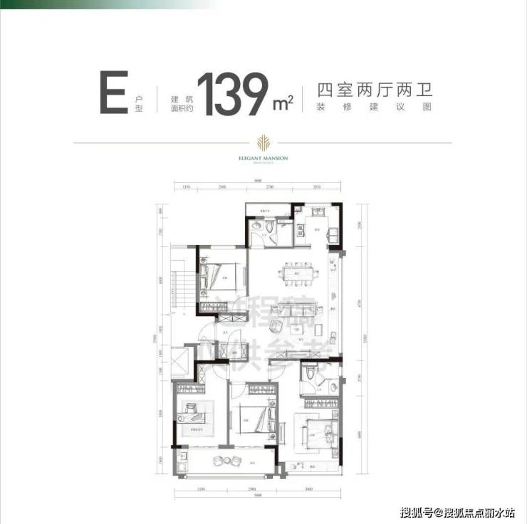 建面约139㎡也是三开间卧室朝南,1个卧室朝北,餐客厅竖向安置,属于当下最优化的大户型设计了。