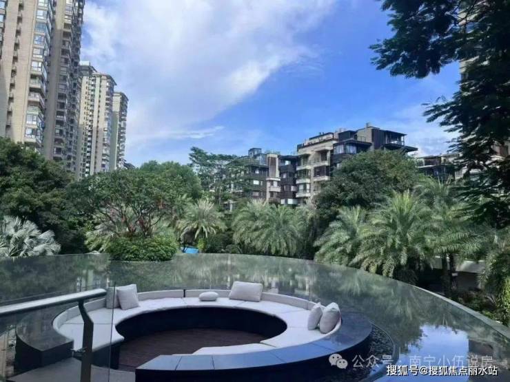 小区园林走的是巴厘岛度假风,里面有个1000㎡的泳池,旁边种着从巴厘岛引进的鸡蛋花。夏天在这里游泳,简直像在国外度假。而且园林里的树都是成年树,直接全冠移植,住进去就能享受绿荫,这点相当良心。