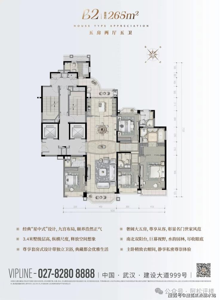 7号楼均为265平户型,五房五厅五卫,独立电梯入户,四开间朝南,南北通透,五间房都自带卫生间,或采光阳台或飘窗,其中包含一个保姆间。不过这个户型想象力不足,相对常规,属于三代住宅中的常规结构,赠送面积和得房率都很一般,也没有如今四代户型主流的全景舱三面采光设计,该项目其他户型亦是如此。
