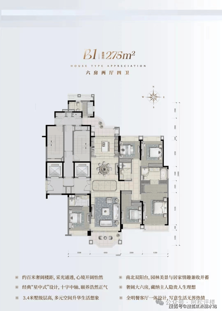 8号楼均为275平户型,六房两厅两卫,空间布局与265平差不多,多一个北向的卧室,客厅阳台尺度更大一些。