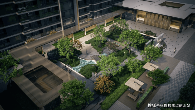 3、“莲影流觞”中央水庭院景观,12米宽幅层叠水幕+4.9米高差跌水——远远望去,宛如一幅流动的山水画,在内环做出这样的水景,本身就是一种底气。