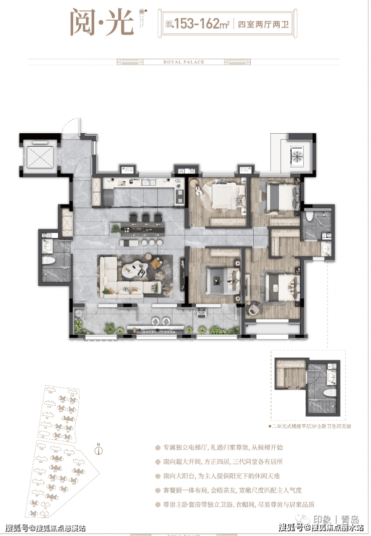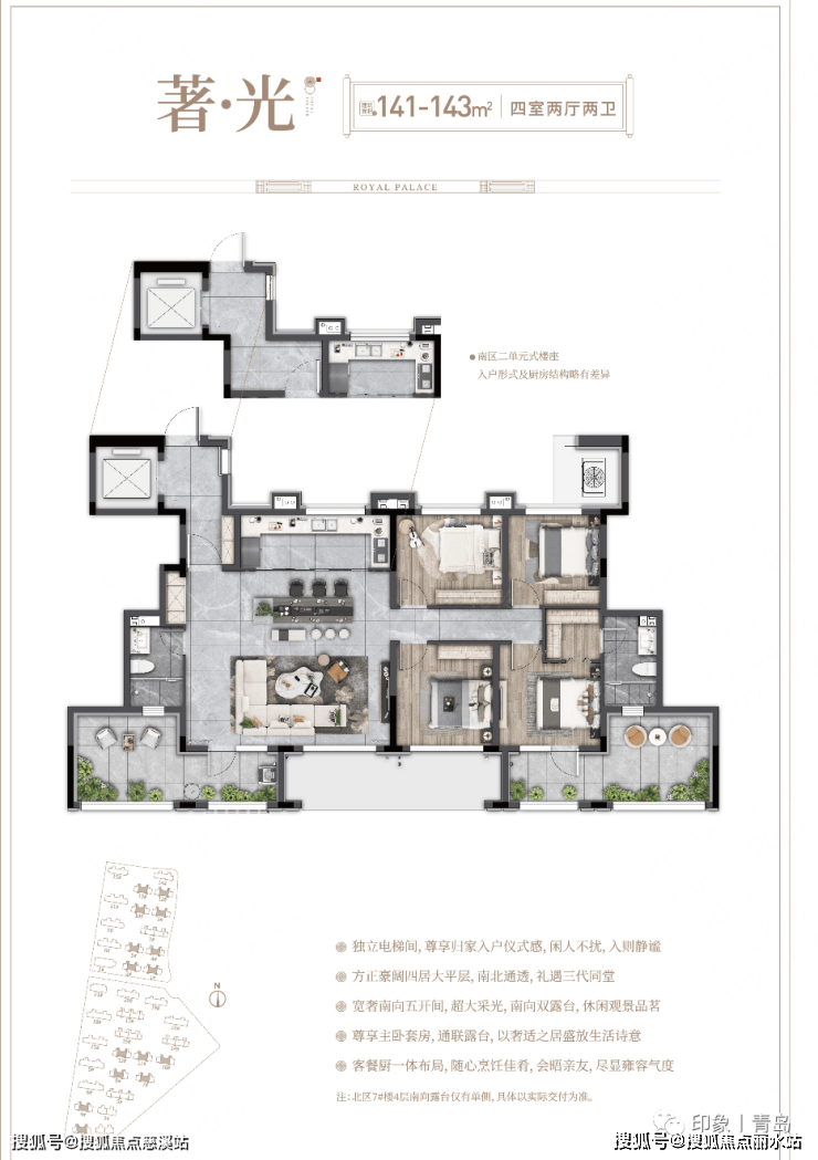 匠筑建面约140-170㎡新中式大宅,青岛罕有得房率约110%的臻品叠墅。大国府院,阔景升级,瞰景揽园,采光加倍。
