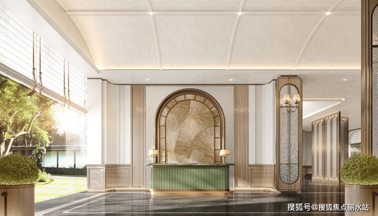 邻里中心接待前厅以芬迪绿色接待台和华美的背景墙为序幕。步入全龄共享的邻里中心,宽敞明亮的大堂空间采用温暖的米白色与金色为主调,与绿色接待台形成和谐而高贵的配色方案,巧妙融合现代设计语言与传统人文情怀。