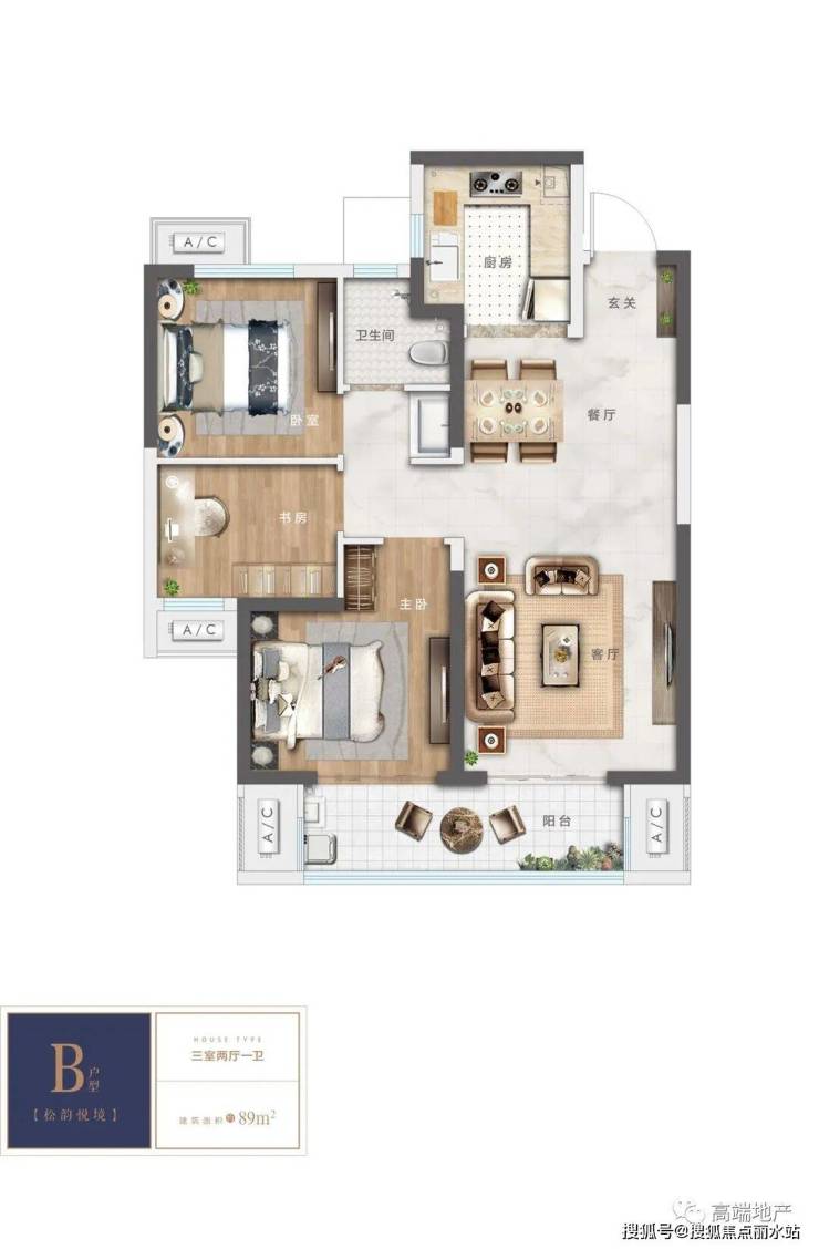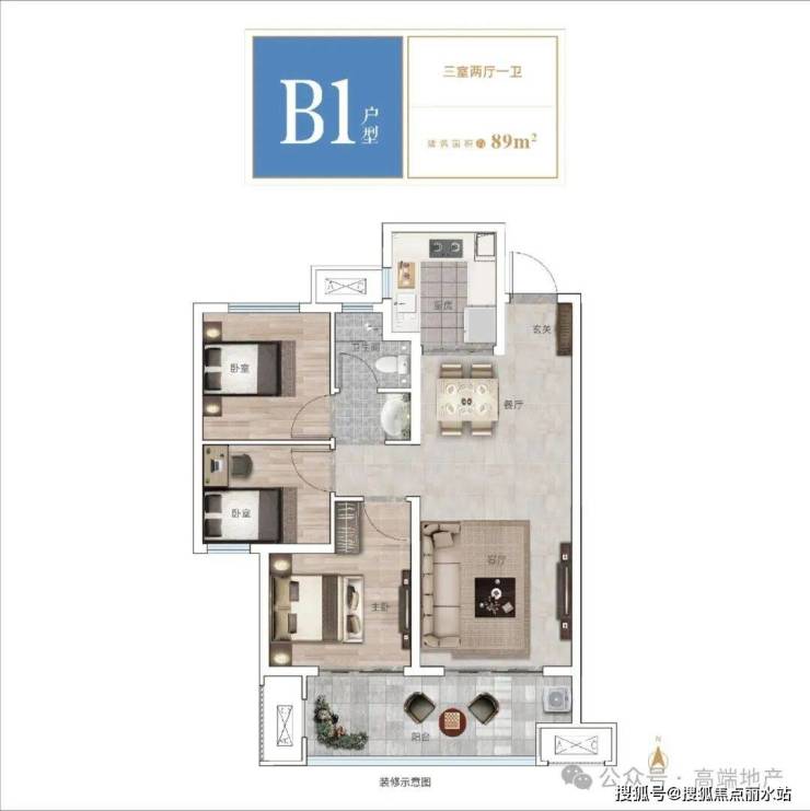 89㎡~三室两厅一卫,全明设计,经济三房,南北通透,餐客一体,超大一体化7平米阳台。(市面上非常稀缺产品)