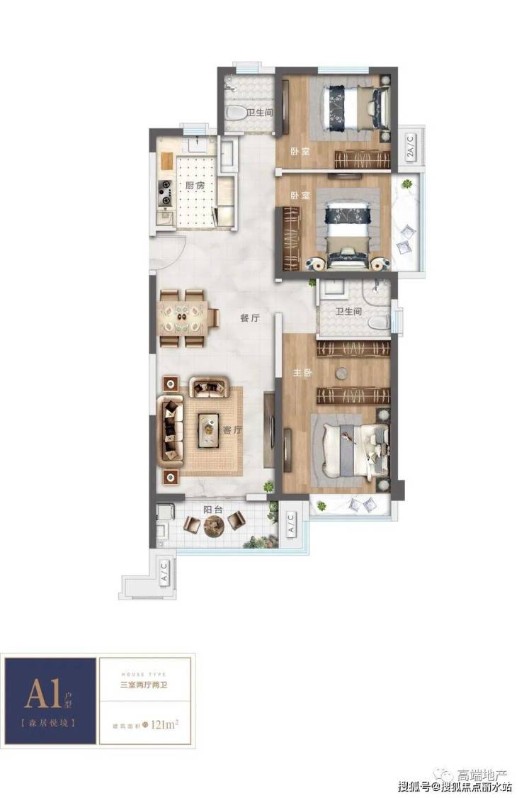 121㎡~三室两厅两卫,南北通透,全明设计,双景观大阳台,动静分区,流线合理,主卧带独位 衣帽间和大飘窗,270度河景大宅