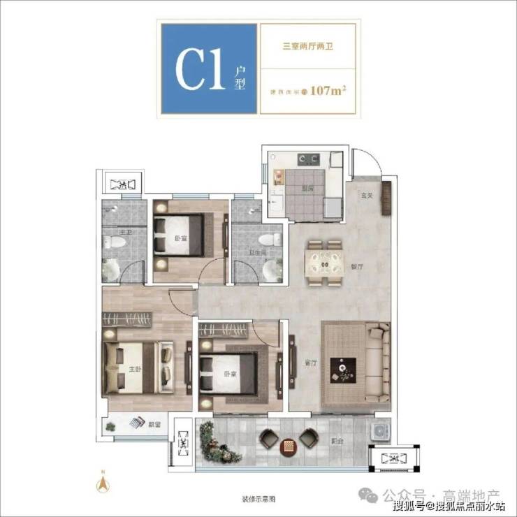 107㎡~三室两厅两卫,全明设计,南北通透,餐客一体,双阳台,河景大三房