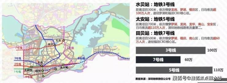 项目周边拥有3/5/7号线三条地铁线,距离水贝站约300米,太安站约700米,田贝站约500米,横穿龙岗、罗湖、福田区,日均客流量大,途径罗湖、福田商业区。衔接各个成熟办公区,通过一次换乘可达深圳所有区域,交通十分便捷。(距离来源:百度地图)