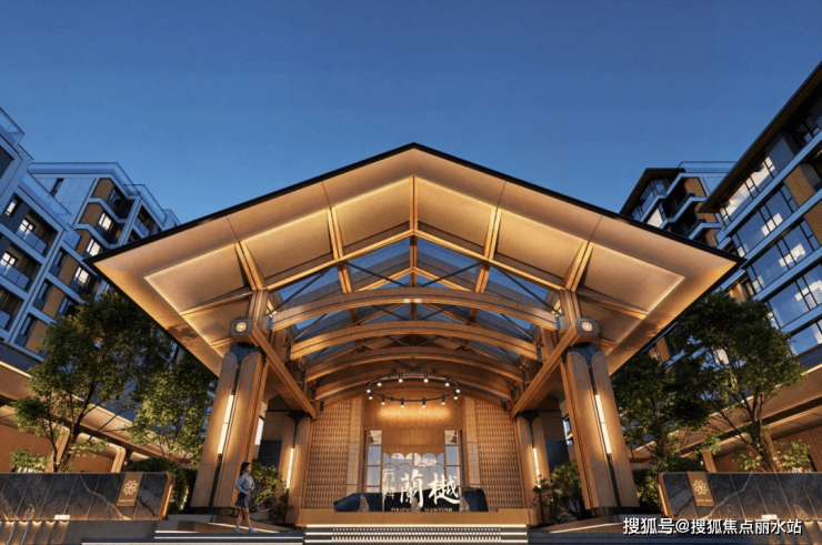 社区规划高达12米高的鼎阔大屋檐,迎宾界面更宽达56米,让归家的尊崇感达到极致。两侧静水界面环绕,中央四根天地柱镇守四象,拱守典雅奢阔的归家礼堂。大屋檐下,是精致的人间烟火,是社区品质感的具象化。