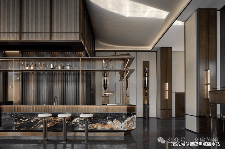 在动线上,设计团队通过高耸屏风巧妙分隔,形成更为私密的社交区域。弧形吧台与阵列酒柜,黑石与金属构件的交织,加之层次分明的灯光处理,使得空间呈现出一种克制而高级的节奏感。