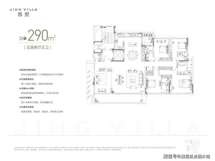 建面约 290㎡的阔尺户型,规划 5 房 5 卫格局,得房率高达 90%,空间利用率堪称极致。