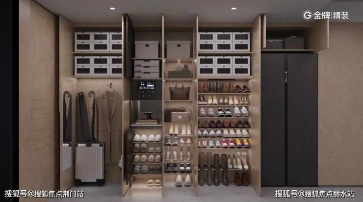 这不再是传统意义上的玄关柜或鞋柜——而是一整组智能分区系统,雨伞槽、抽屉式小物收纳、高低频鞋层分区、内嵌式坐凳+扫地机器人预留槽,再搭配除湿除臭的“鞋柜精灵”。