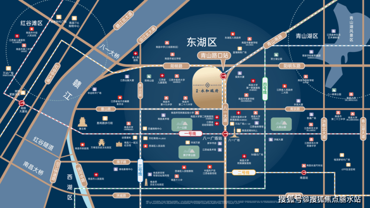 作为南昌罕见的双地铁上盖项目,地铁・永和瑞府的区位优势尤为突出。项目择址八一大道与阳明路黄金十字交汇处,紧邻地铁2、3号线青山路口站换乘枢纽,无缝衔接城市主干道,实现“出站即归家、下楼即繁华”TOD理念。展厅内的区位图清晰呈现“一轨直达红谷滩、老城商圈” 的便捷,周边配套设施齐全,涵盖优质教育资源、医疗设施及休闲购物场所,让“零通勤等待、生活需求步行可达”的理想生活触手可及。