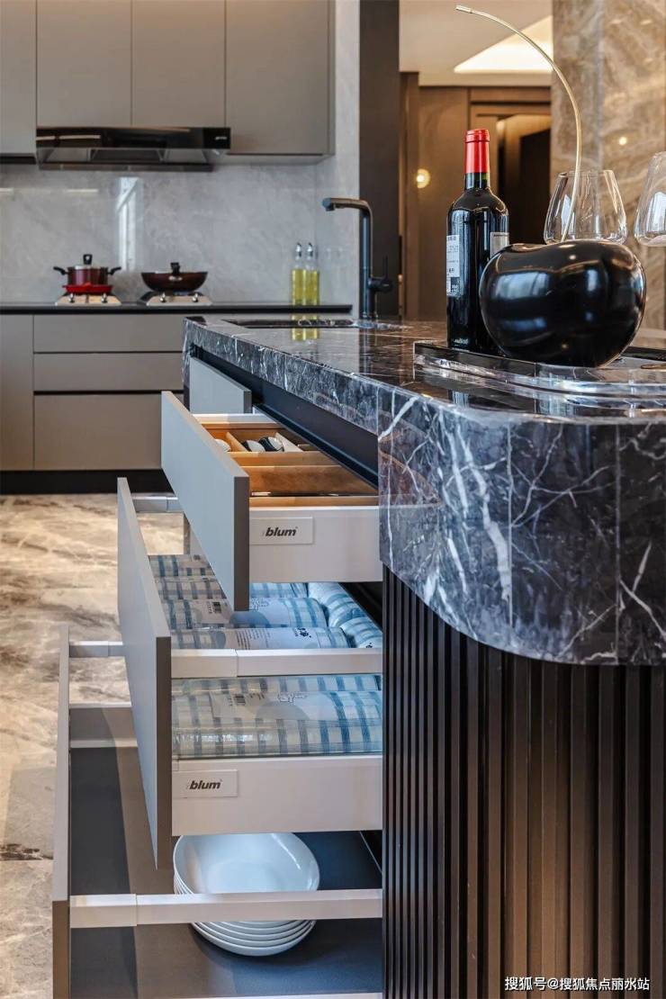 中岛的设置,使餐厨部分形成环形动线,下厨流程更为流畅高效。同时将壁炉、餐边柜的弧形元素延伸至岛台,成为贯穿空间的视觉纽带,在功能与美学之间达成和谐统一。