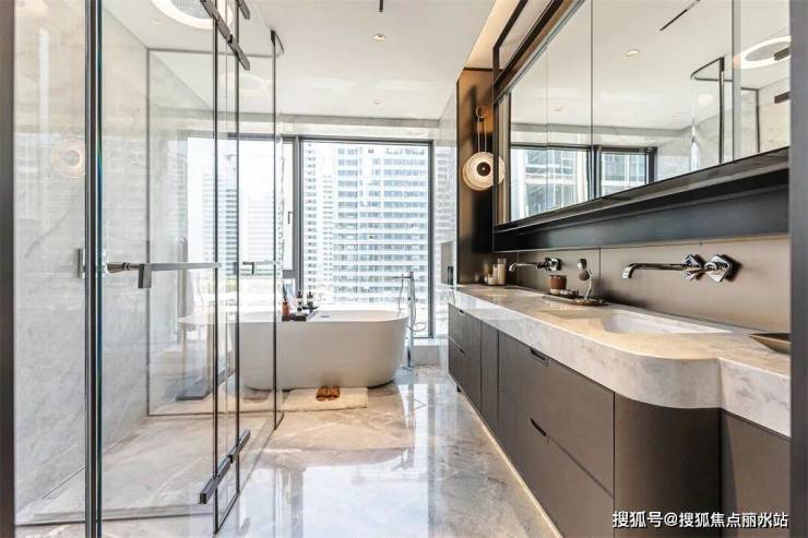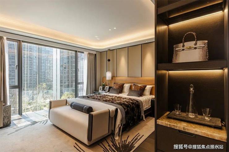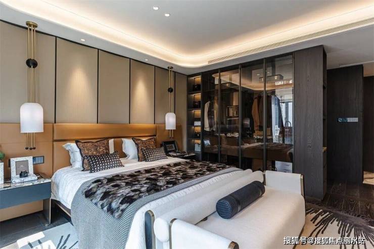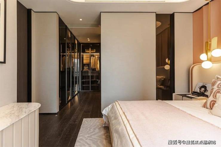 主卧自成一方宁静休憩之所,内设独立的衣帽间和盥洗室,生活动线便捷高效,日常起居井然有序。可视化衣帽间设计,木、金属、玻璃与皮革奏响材质的交响,勾勒出通透明晰的功能分区,清雅而不乏奢感,让衣柜化身为一处赏心悦目的优雅陈设。