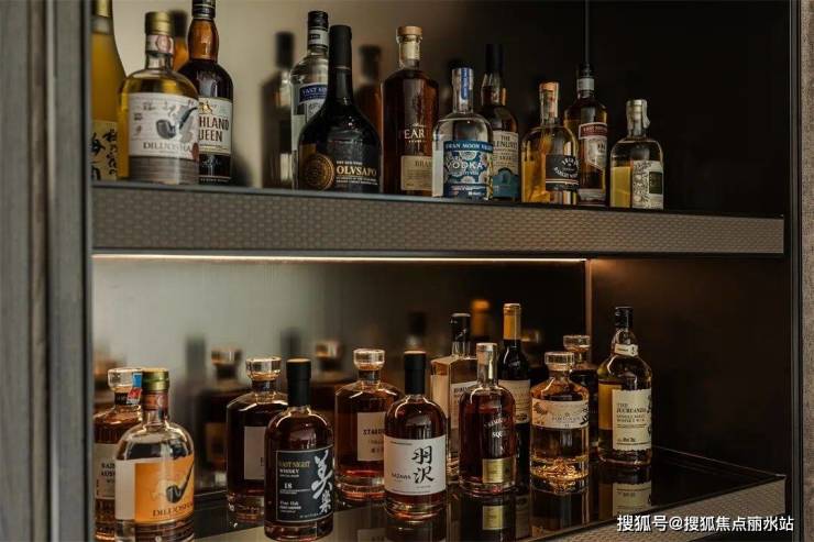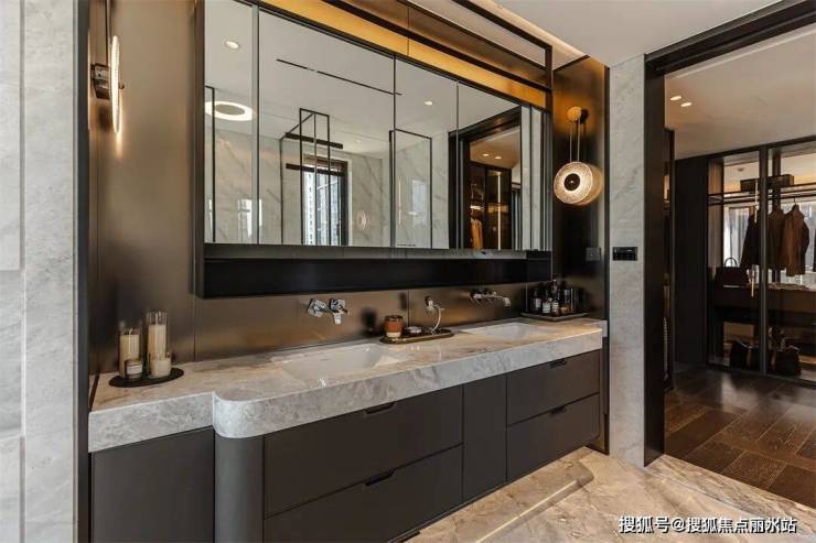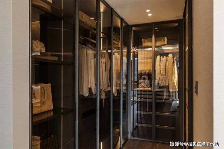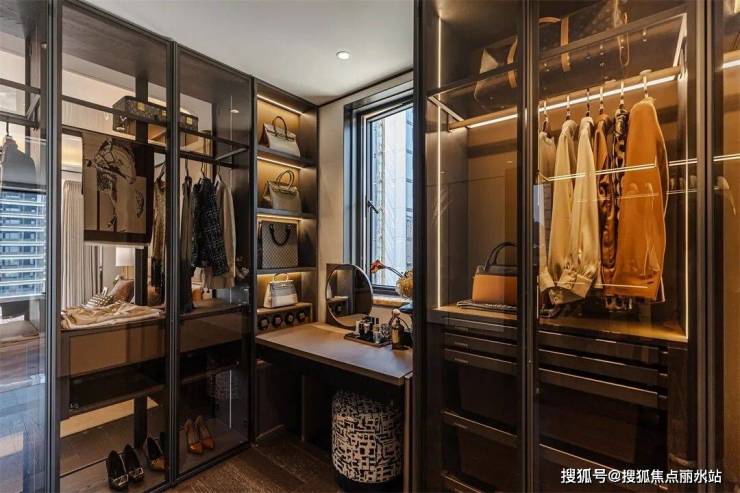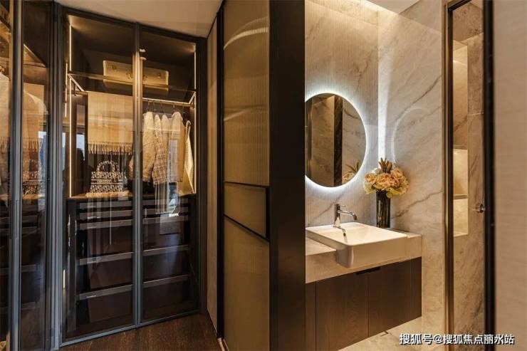 衣柜侧面设开放格,巧妙整合木、石、玻璃与皮革多种材质,灯光辉映下,倍增高级感。柔软的皮革纹理,不经意间散发出熨帖身心的温润与舒适。