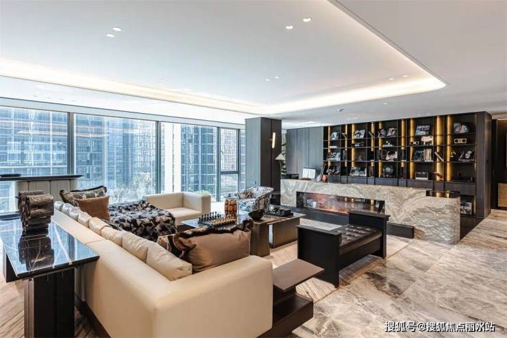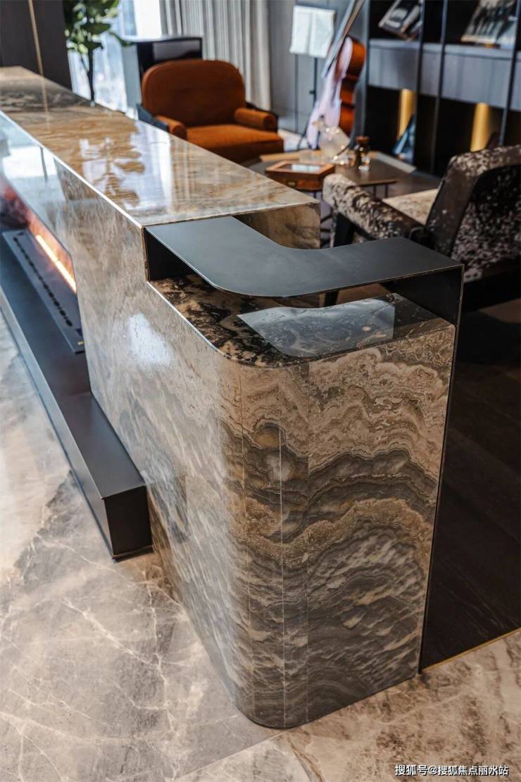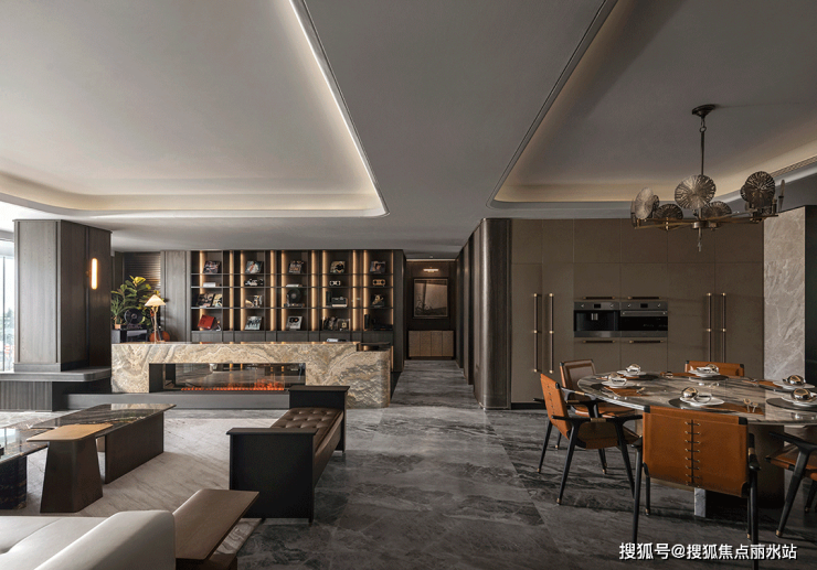 壁炉墙与玄关采用同款奢石,统一设计语言的同时,恰到好处的对空间进行了区隔,将奢美精致的定制格调充分演绎。