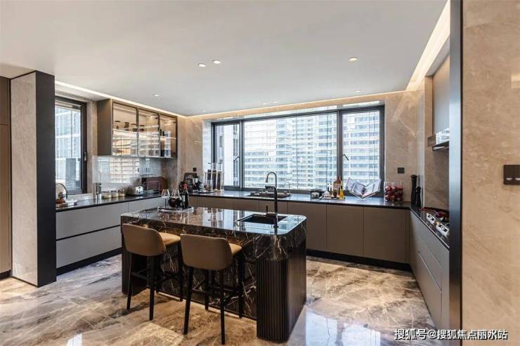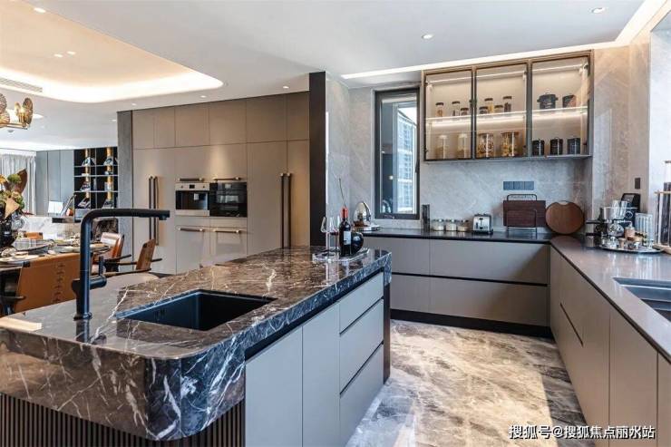 U型布局的厨房空间,铝框玻璃吊柜与玻璃层板在灯光下勾勒出轻盈轮廓,为空间注入通透的呼吸感。升降调味机、转角拉篮、调料拉篮、餐具收纳等精细化设计,充分挖掘每一寸空间的潜力,在有限面积内实现功能最大化,让厨房始终保持整洁有序的舒适状态。