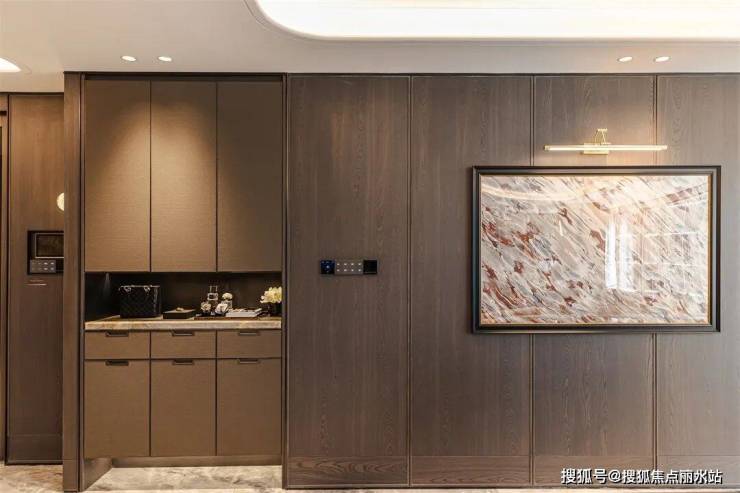 玄关处设独立收纳系统,在满足储物功能的同时,实现了与全屋风格的协调统一,细腻的皮革纹理,让收纳也成为了一种艺术。柜内安装鞋柜精灵,实现除味、杀菌、除湿,保持柜内环境时刻清新干爽。