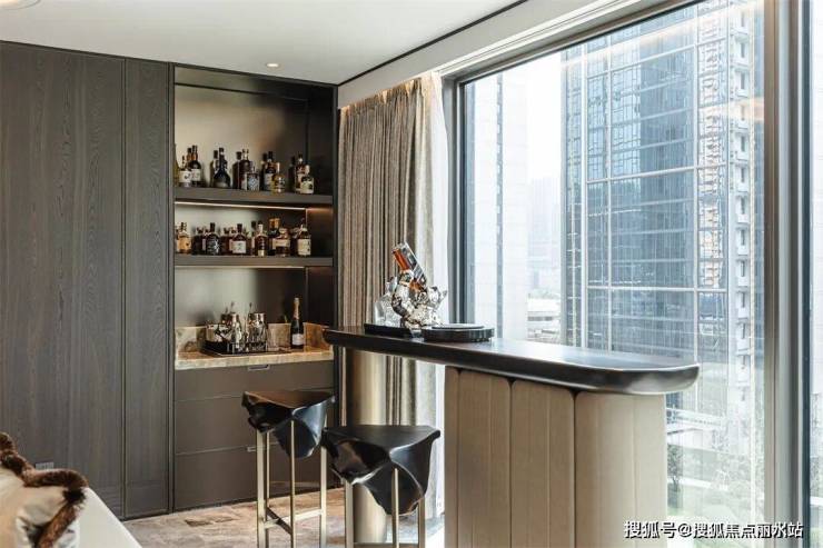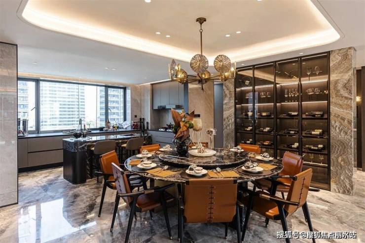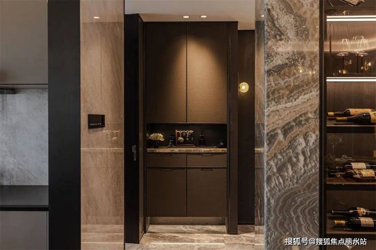餐厅一侧铝框玻璃柜嵌入玄关奢石,奢石加持高级感倍增,一体化的形式下更添品质属性。