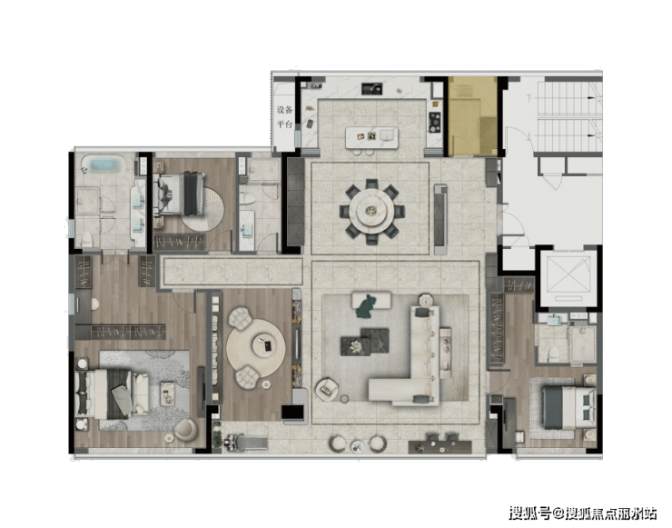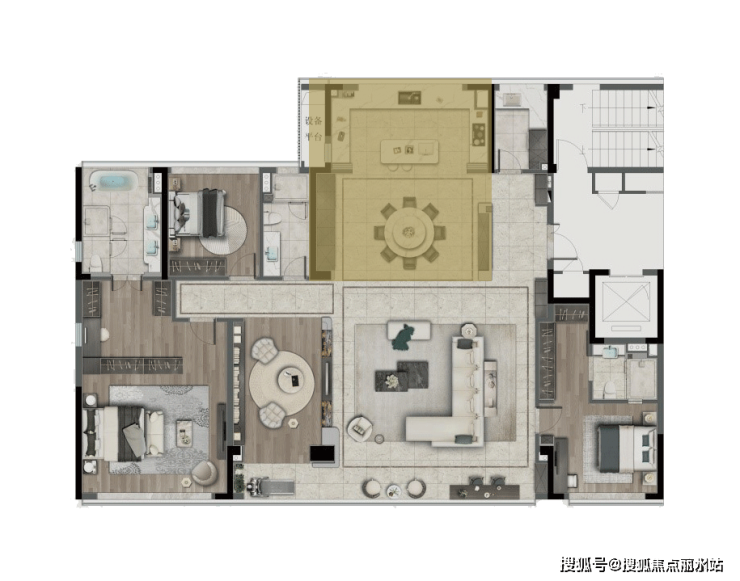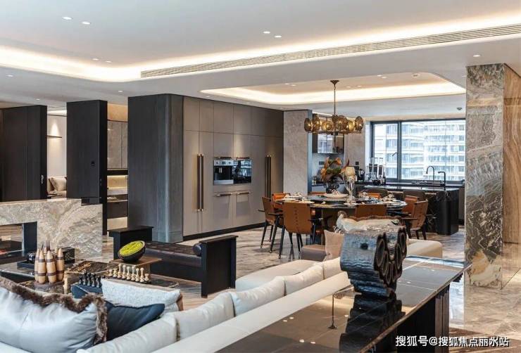 LDKB行政通厅,建面约80㎡阔绰空间,南向约20m超大面宽,构建社交与生活的双重舞台。通过对整个空间的布局分割,保持整体性的同时,区隔出不同的功能区域,最终呈现出高度和谐统一、极具品味的大宅属性。