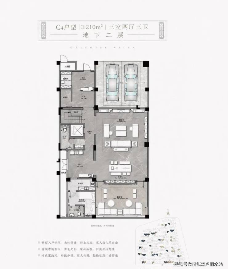 以项目东北角的建面约330㎡H户型为例,地下二层的室内可配置保姆房、