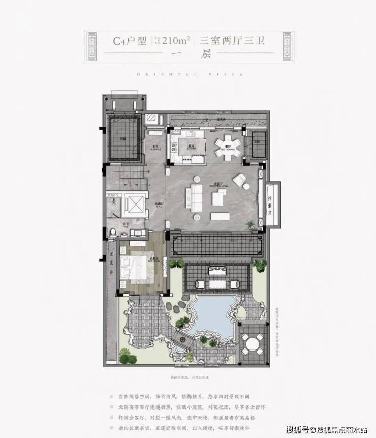 品茗区,室外可设置一个园池檐亭的中式庭院。