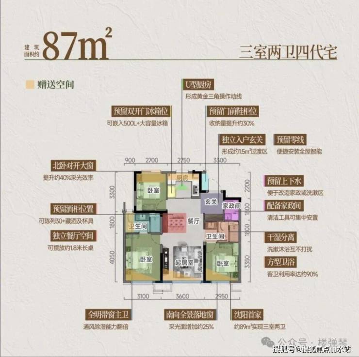 看户型:项目堪称“空间魔术师”。高层得房率最高达107%,洋房最高达124%,数据表现相当亮眼。即便是建面约87㎡的高层户型,也做到了三室两厅两卫+双南向套卧,还罕见配备了独立家政间,功能性与舒适度兼顾。
