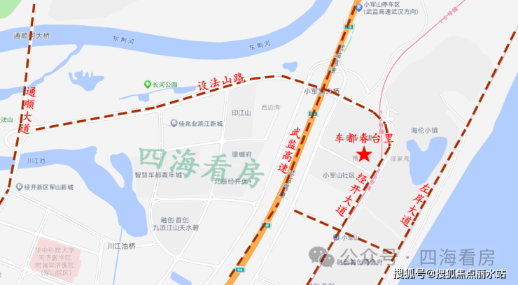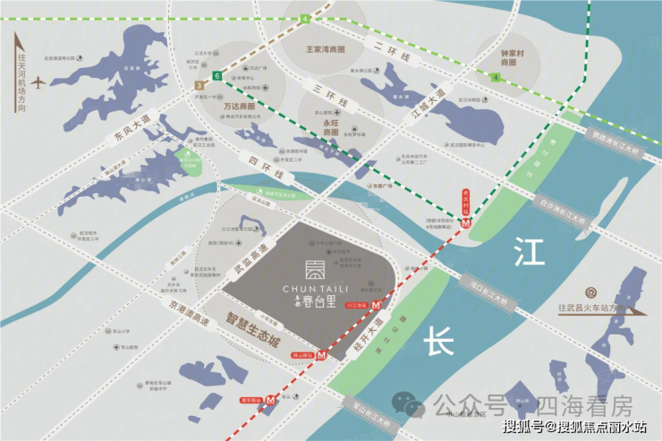自驾:小区临经开大道,经开大道与武监高速(免费)和通顺大道,武监高速可与四环线相连,过桥就是武昌白沙洲、江夏,也可到汉阳、汉口,武监高速向北连接江城大道,直达经开核心、汉阳四新、汉口等板块。沿设法山路到通顺大道则可以到达东风大道方便,那边的产业也比较多。