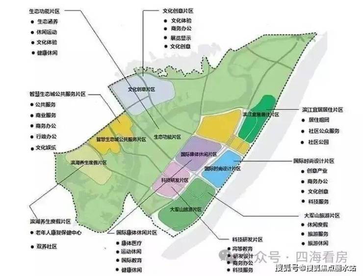 智慧生态城规划有生态功能片区、文化创意片区、滨江宜居居住片区、智慧生态城公共服务片区、国际时尚设计片区、大军山旅游片区、科技研发片区、国际康体休闲片区、滨湖养生度假片区等。