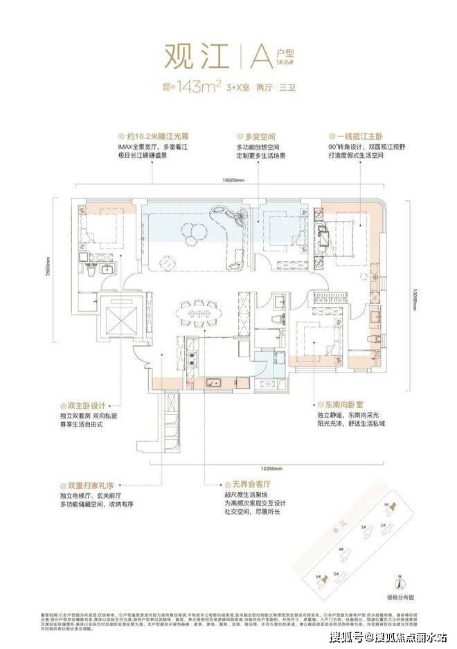 观江143㎡四室两厅三卫:此户型6栋楼内均有布局,2/5号楼均是此户型,两梯两户布局。为了更好的观江效果北面面宽约16.2米,户型进深约10米;项目户型实际做的3+1的格局,双套房设计且都可一线观江;主卧套房拥有270°的观景视野;整体户型加上可优化空间得房率约在98.6%(不含电梯前室)。