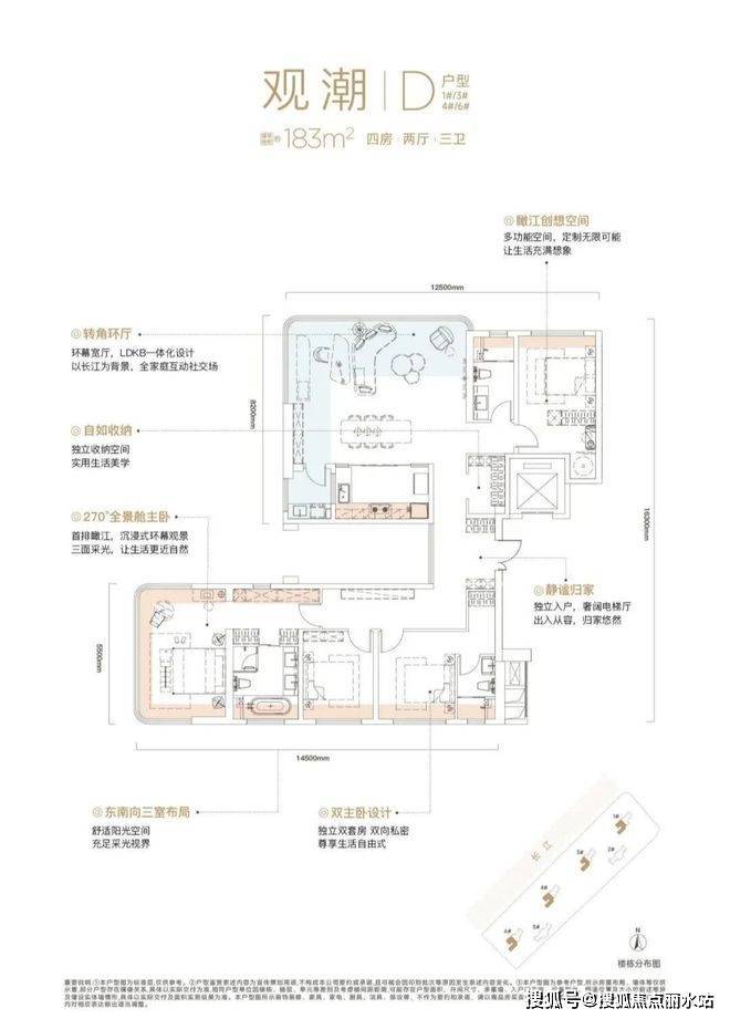 观潮183㎡四室两厅三卫:此户型分布在1/3/4/6号楼西边户型,后期预计会有一定西晒影响;动静分区、双全景舱设计,客厅及主卧均拥有270°观景视野;双套房并预留收纳空间,主卧采用三面环幕设计(享南向日照 + 享北向瞰江资源);整体户型加上可优化空间得房率约在109%(不含电梯前室)。